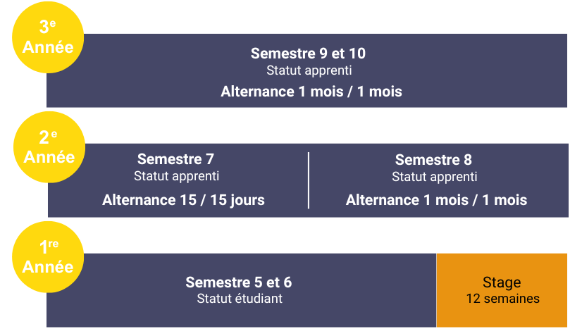 Elle se poursuit par deux années en apprentissage, permettant à l’élève-ingénieur de s’insérer progressivement dans le monde professionnel et de connaître une montée en compétences concrète et valorisante.